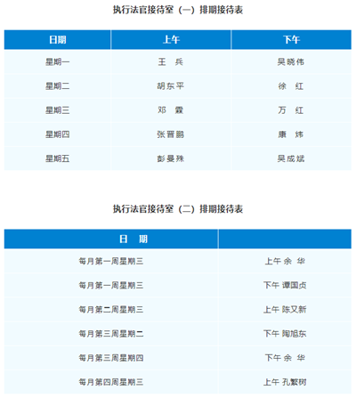 关于约见执行法官的注意事项 1、执行法官接待室接待时间为:9:00-11:30、14:00-17:30。 2、约见执行法官时,一定要注意留心自己承办法官的接待时间,承办法官会给您更为准确的答复! 具体的接待排期安排,看下图↓↓↓