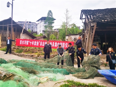 为持续推进“长江禁渔”行动,保护渔业资源,近日,酉阳县公安局酉水河水陆派出所联合酉水河镇政府、渔政部门、海事处等,在酉水河流域酉水河镇段开展长江流域禁捕法治宣传巡展和护渔专项行动,现场销毁地笼10副、渔网20余张。 通讯员 李小林 记者 饶果 摄 |
