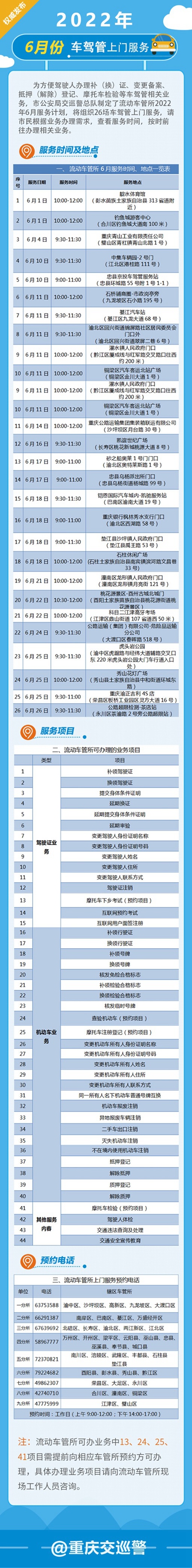 ![]() 本网讯(记者 唐孝忠 实习生 王文思)5月31日下午,重庆市公安局交巡警总队发布流动车管所6月服务计划称,将组织26场车驾管上门服务,请市民根据业务办理需求,查看服务时间,按时前往办理相关业务。此举将方便驾驶人办理补(换)证、变更备案、抵押(解除)登记、摩托车检验等车驾管相关业务。 注:流动车管所可办业务中13、24、25、41项目需提前向相应车管所预约方可办理,具体办理业务项目,请向流动车管所现场工作人员咨询。 |