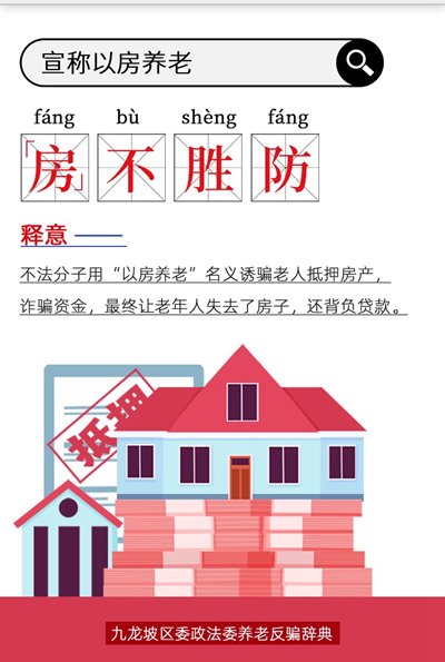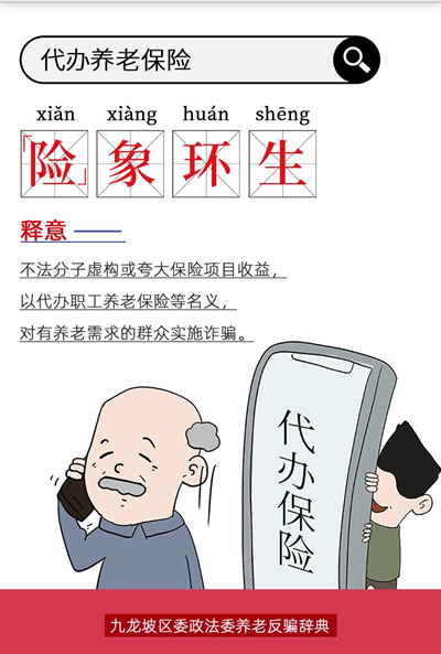 本网讯(记者 李亚) 开展“指尖”普法,让常见养老骗局一目了然。近日,九龙坡区在打击整治养老诈骗专项行动中,专题推出了《养老反骗辞典》系列海报,将日常生活中六大类养老诈骗套路进行归纳总结,用生动直观的绘图展示,帮助老人提高防诈“免疫力”,守住养老钱,幸福享晚年。