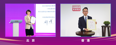 △广东省委常委、宣传部部长陈建文 发布仪式上,中央广播电视总台编务会议成员邢博与香港电台台长李百全通过云签约的方式,代表双方达成协议,正式授权香港电台通过数字地面电视平台转播中央广播电视总台CGTN纪录频道,通过调频频率FM102.8播出粤港澳大湾区之声,于7月1日整频道整频率落地香港播出。与此前落地香港的总台央视综合频道(CCTV-1)、中文国际频道(CCTV-4)、戏曲频道(CCTV-11)、新闻频道(CCTV-13)、CGTN英语新闻频道等一起,为香港同胞提供更多喜闻乐见的视听节目。