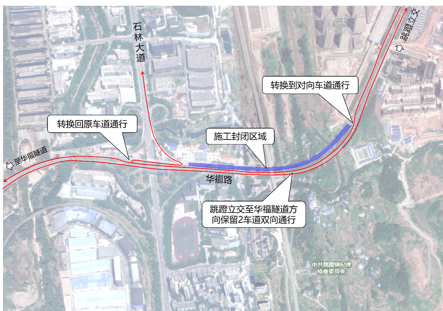 导流方案二:7月9日晚上10点-7月10日凌晨6点,共计8小时。华福大道(跳蹬立交至华福隧道方向)全部封闭管理,跳蹬立交方向来车→通过对向车道和石林立交转换→石林大道;跳蹬立交方向来车利用对向车道通往华福隧道方向。