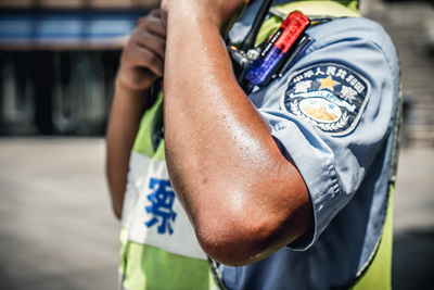 15时30分,刘宝章巡逻至观音桥步行街南门,将车辆停放后,下车补充水分并冲洗脸上汗水。虽然只有几分钟,但摩托车车垫已烫得无法坐人,他熟练地拿出毛巾,在上面浇上凉水后直接跨骑而坐,“不怕打湿裤子,不到一分钟就干了。”拉下头盔,发动引擎,巡逻工作继续进行。