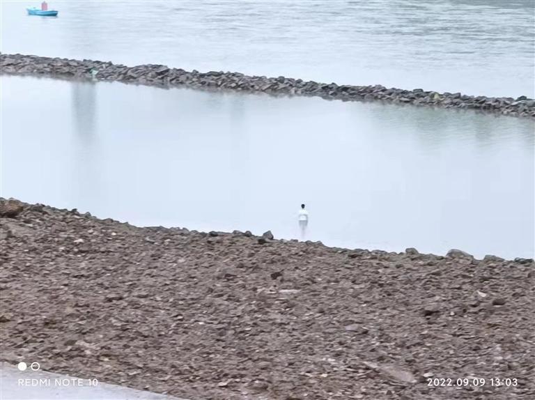 沈女士已走入江中 一位老人指着上游方向说,他之前看到民警所描述的女子在江边徘徊。民警听后迅速顺着老人指的方向飞奔而去,跑了大概300米,看到一白衣女子正站在江水中。“快上来!”民警大喊着奔向江中,和柳先生一起拉住沈女士,紧随其后的辅警接力将沈女士拉上岸。