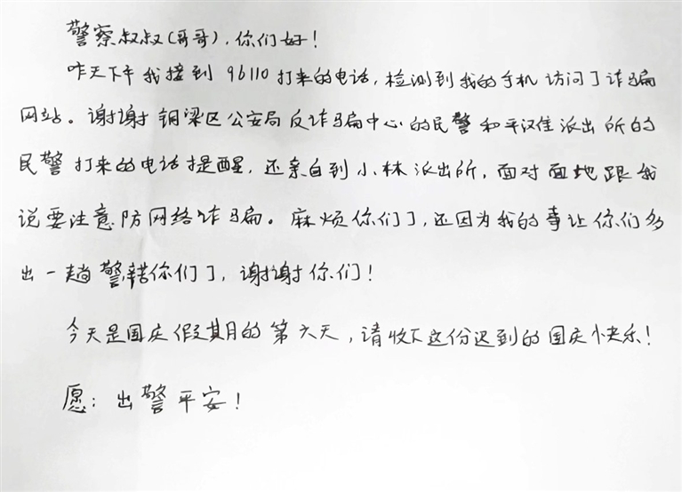张女士给民警送来鲜花和感谢信 “今天是国庆第六天,请收下这份迟到的礼物……愿出警平安!”秋意浓浓,心意暖暖,纸短情长,感谢信虽然只有短短几行,但饱含张女士的感激和祝福,让民警心中泛起暖意。 10月5日15时许,平滩派出所值班民警夏灿接到铜梁区反诈骗中心预警劝阻指令:张女士正在点击刷单诈骗网站,存在被电信网络诈骗风险。 高危预警,刻不容缓,民警立即通过“一标三实”基础信息采集系统查询到张女士详细信息,随即通过电话与其取得联系。“您好,我是铜梁区公安局民警,您正在浏览刷单诈骗网站,请千万不要转账!”正在进行刷单操作的张女士被民警的电话打断,但她对民警的话将信将疑。在民警的反复叮嘱下,张女士停止了转账,民警随即赶往小林镇与其见面。 民警见到张女士后,为其下载了“国家反诈中心”App,并向其列举近期相关电信网络诈骗案例,叮嘱她提高防范电信网络诈骗意识。经民警耐心劝说,张女士意识到自己遭遇了电信网络诈骗,表示自己不会再随意点击链接进行刷单,并对民警的及时劝阻和尽心尽责表示衷心感谢。次日,她带着手写的感谢信和一束向日葵来到平滩派出所,再次向民警表达了谢意。 |