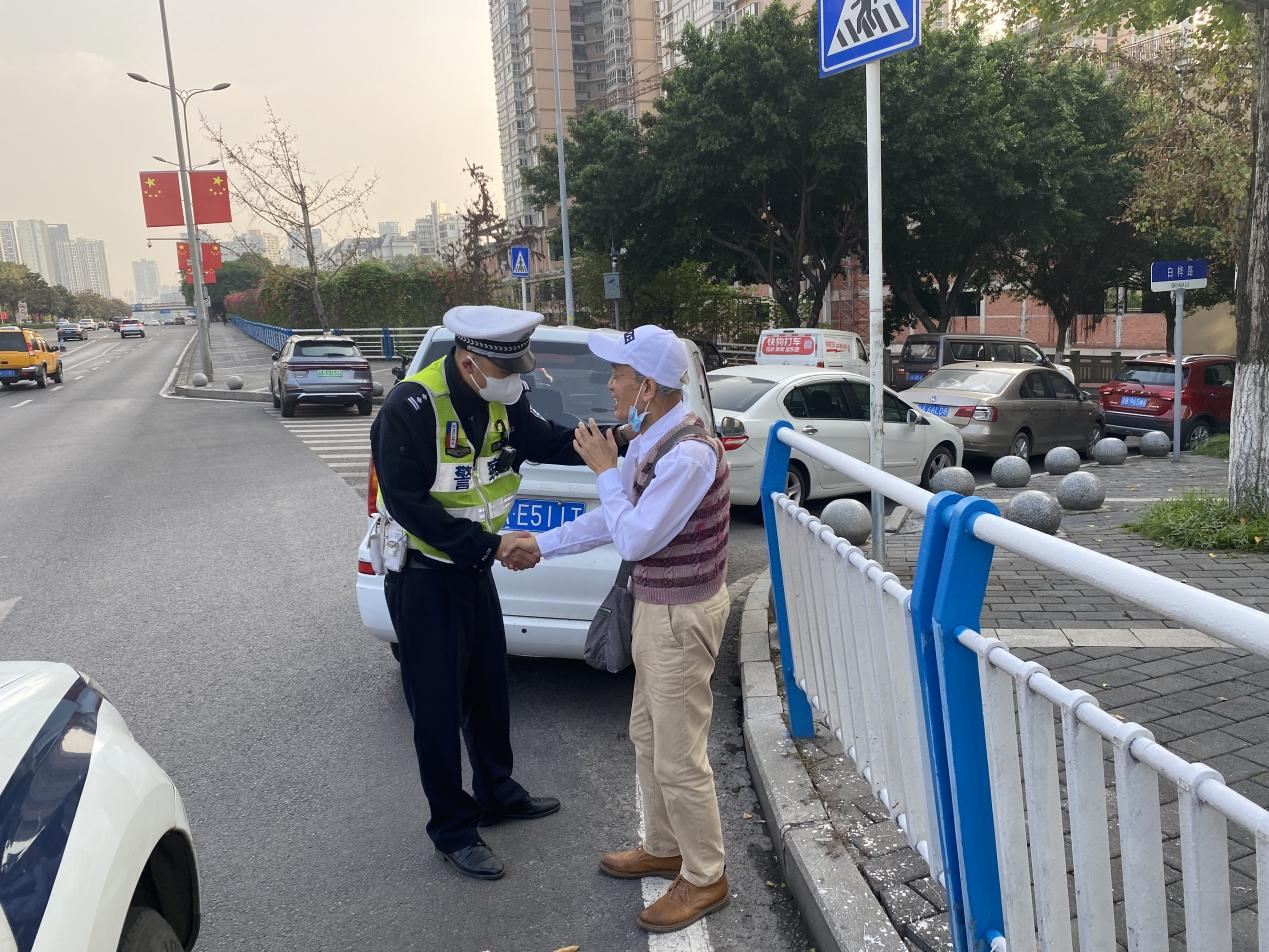 老人紧握民警的手表示感谢 经查,该老人姓邓,79岁,身体健朗,一直有步行锻炼身体的习惯。当日下午16时许,邓某从人和附近出发,沿着附近的道路步行,走着走着误入兰海高速北环立交至经开大道路段时被巡逻民警及时发现。民警在询问情况后将老人送至安全的地点,嘱咐其锻炼身体一定要选择走安全的路段。