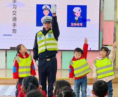 在南坪镇中心小学幼儿园,民警戴上平安虎、畅畅兔的卡通头套,带领小朋友们做游戏认识交通标识,提醒他们乘车系好安全带、不随意横穿马路、不在马路上逗留玩耍。民警还布置了“家庭作业”,让小朋友回家将交通安全知识传递给家长,做好交通安全宣传员。