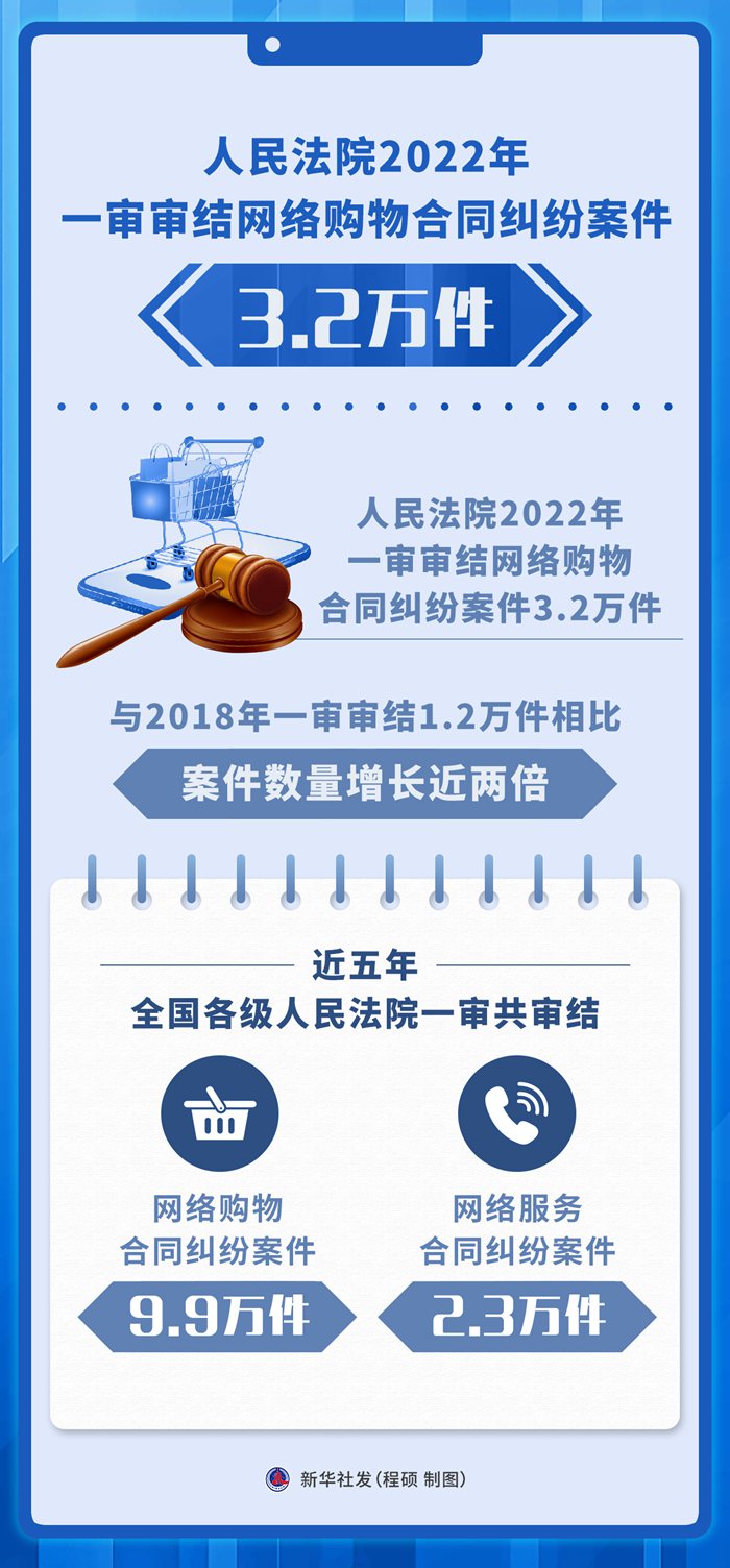 新华社北京3月15日电(记者齐琪、罗沙)人民法院2022年一审审结网络购物合同纠纷案件3.2万件,与2018年一审审结1.2万件相比,案件数量增长近两倍。 这是记者从最高人民法院15日召开的网络消费典型案例新闻发布会上获悉的内容。 据介绍,近五年全国各级人民法院一审共审结网络购物合同纠纷案件9.9万件、网络服务合同纠纷案件2.3万件。除这两类案件以外,还有大量涉及产品责任、租赁合同、旅游合同等网络消费的案件。 近年来,最高法主动适应消费者权益保护的新形势新要求,加大消费者权益司法保护力度,积极营造有利于消费升级的法治环境。针对网络消费领域的法律适用问题,2022年3月制定并发布了《最高人民法院关于审理网络消费纠纷案件适用法律若干问题的规定(一)》,对网络直播营销、外卖餐饮等群众普遍关切的问题作出回应。 当日,最高法还发布了10件网络消费典型案例,涉及负面内容压制合同效力、消费者个人信息保护、未成年人网络充值等问题。 最高人民法院副院长贺小荣表示,消费者权益司法保护工作事关民生福祉和经济社会发展,人民法院将进一步发挥审判职能作用,为保护消费者合法权益、护航经济高质量发展提供更加有力的司法服务和保障。