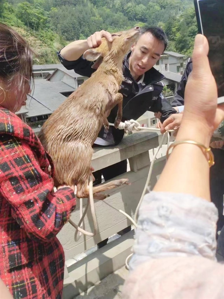 本网讯(记者 杨 雪 通讯员 邓 敏) 近日,巫溪县公安局田坝派出所接群众报警,称发现一只野生麂子被困,需要帮助。 民警赶到现场发现,一只国家“三有”(有重要生态、科学、社会价值)保护动物小麂,被困在水沟旁的一处陡坡上,陡坡距路面约10米高,四周被公路坡坎、水渠阻断,小麂被困其中,进退不得。 由于无法步行至小麂被困点位,民警利用绳索从公路下滑到陡坡上抓着小麂,然后与群众合力将小麂带回路面。经仔细检查,小麂没有受伤,民警随后将其放归大自然。
