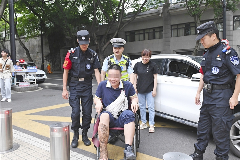 6月7日早上7时许,求精中学校门外,一名坐在轮椅上的考生在家人陪伴下来到考点。原来几天前,这名少年不慎被蛇咬伤进行了手术治疗,短时间内无法行走。“来,我推你!”正在考场外执勤的渝中区公安分局交巡警支队上清寺大队民警蔡智祥看到后,迅速上前接过孩子家人手中的轮椅,一路将考生护送至校门口,然后交给学校保安,众人接力将孩子送入考场。 记者 李 亚 摄