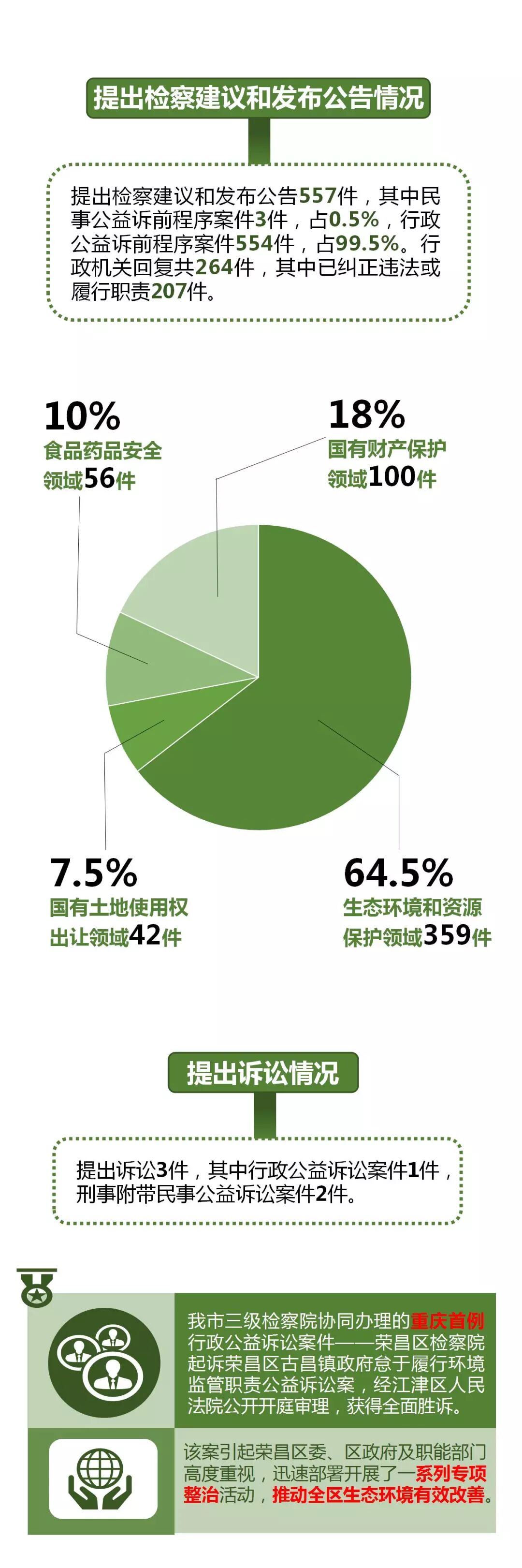 紧紧围绕公益保护目标,在生态环境与资源保护、食品药品安全、国有财产保护、国有土地使用权出让、英烈保护等领域全面依法履行公益诉讼职责,各领域、各办案单位实现诉前程序案件全覆盖。 重庆检察公益诉讼一年成绩单